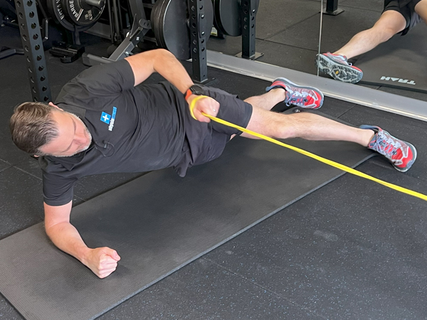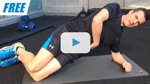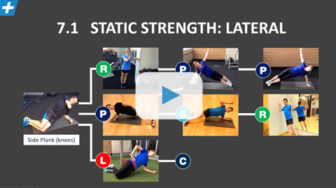 Start in sidelying, leaning on your elbow and forearm. Keep your elbow directly under your shoulder and your knees bend to 90 degreees, and heels in line with your hips. Move your hips into a squat position and tilt the pelvis so your lumbar spine is in neutral and not sagged down. Stiffen and activate the core, grab your shoulder and resist with by pulling backwards.