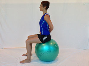 | Sit on the swiss ball (try and find a ball the right size so that keeps your thighs almost parallel to the ground when in sitting.) Rest your feet hip distance apart with your toes facing forwards. Find neutral spine by tilting your pelvis forward and backwards. Make the movements smaller until you are rested in neutral spine. You should be sitting directly on top of your sitting bones. Draw shoulder blade towards buttocks and gently push one heel into floor. Slowly take the weight out of your leg and lift your foot off the floor. (DON'T your pelvis rock sideways or tilt backwards). Hold shoulder blade, tummy and buttock ON. Practice breathing for 5 secs, then lower leg back down. Repeat with the other side, do more on weaker side.