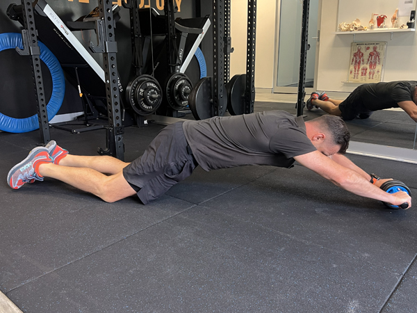 | This exercise if for strengthening your anterior core and outer core muscles, while learning to control and maintain neutral spine with movement. This exercise helps increase your abdominal strength and ability to develop your plank strength. It is a pre-cursor for a normal ab-wheel roll out and will help you progress to being able to do this exercise. |