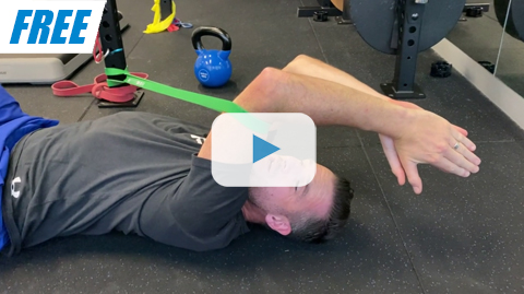 Start by looping a power band around a pole close to floor height. Lie on your back and loop the other end of the band around your wrist. Your body will be lying perpendicular to where the band is anchored. Move your body away from the band so that you can feel some gentle resistance against the band but not too much. Start with your elbow by your side, the inside of your wrist facing towards you and your elbow bent at 90 degrees. Allow the band to drag you slighly back towards the anchor point, then slowly assist your elbow up off the floor and bring your arm over head. As you move your hand higher, make sure that you keep the same amount of external rotation through your shoulder by not allowing the palm of your hand to roll in towards your body. Keep your elbow at 90 degrees as you slowly bring your shoulder up. Go only to the point where you start to feel tightness, or slight pain but do not push past this point. Keep the tension on the band and make sure your elbow doesn't come in towards your body by gently guiding it with your other hand. Once you reach the limit of your movement, slowly lower your shoulder back to starting position and repeat, keeping the same alignment of your hand and wrist.
